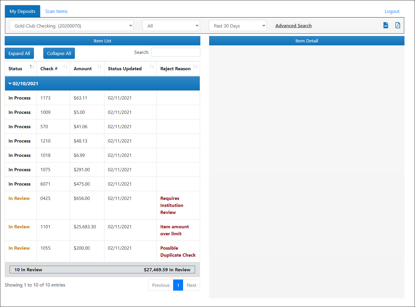 To expand or collapse a list of deposited items for all dates, at the top of the screen, click Expand All or Collapse All. - To sort the item list by status, check number, amount, status updated (date), or reject reason in descending order, click the corresponding column header.