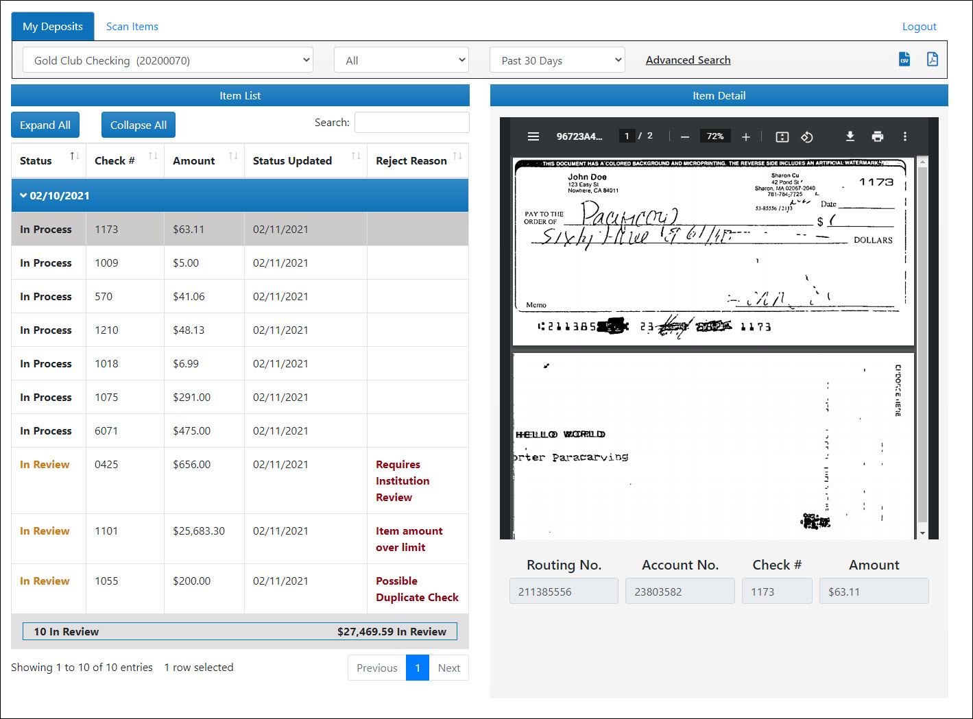 You can also filter the item list by date posted, item status, check number, check amount, status updated (date), reject reason, routing number, or account number at any time by entering the desired information into the Search box. - To see an image of a deposited item, click on that deposited item. The item is shown in the Item Detail window.