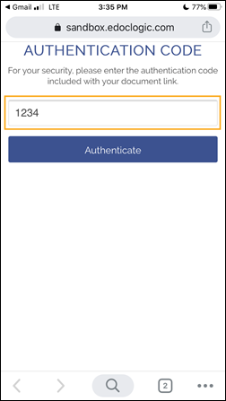 - If an authentication code is required, the signer is asked to enter that code on the next screen.