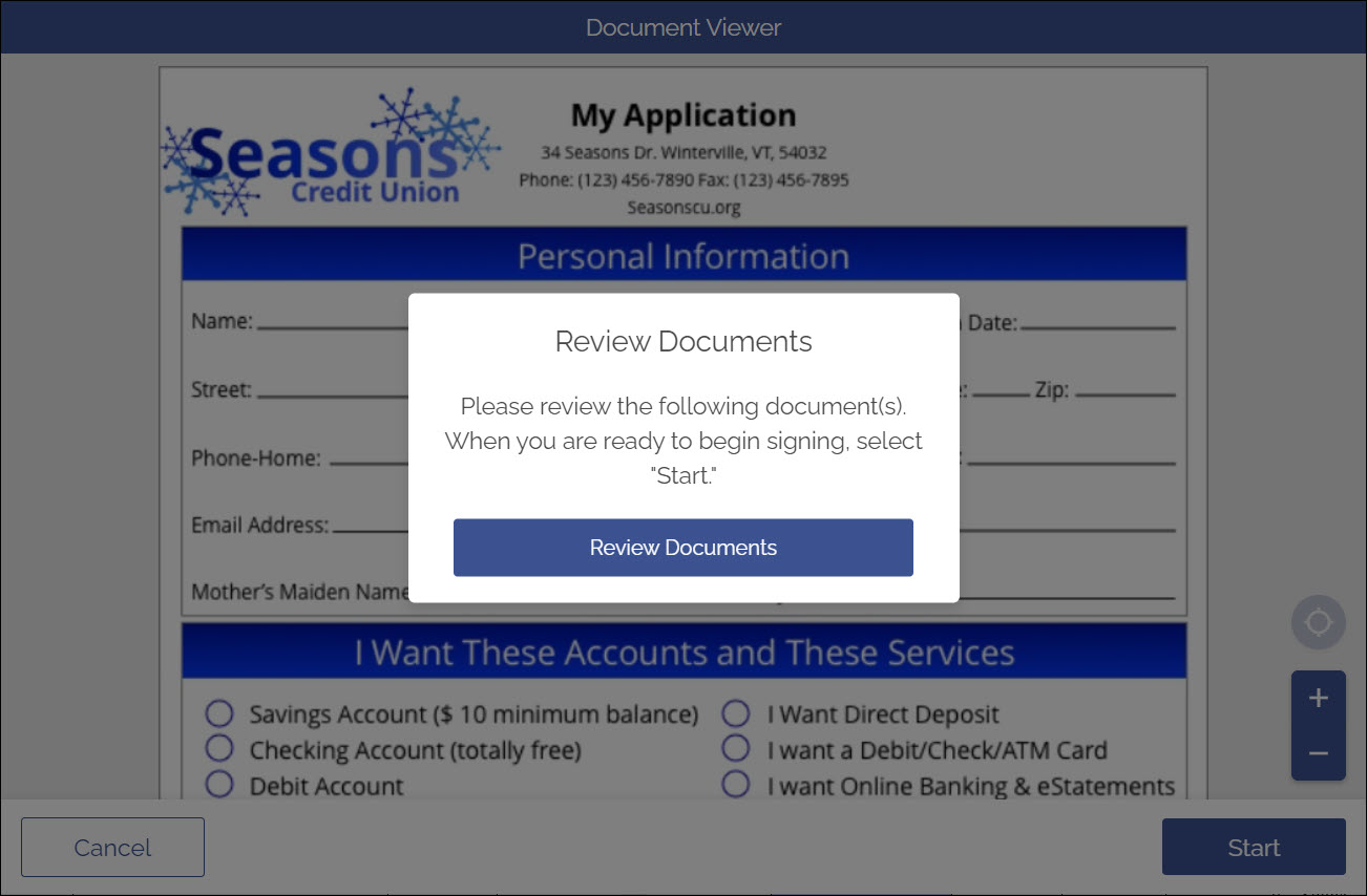 If the signer clicks I Don't Want to Sign/Upload, they are informed that any documents already signed will still be submitted to the credit union, and the credit union may still contact the signer to complete the signing process. - The signer clicks Review Documents to review the document before the signing process begins.