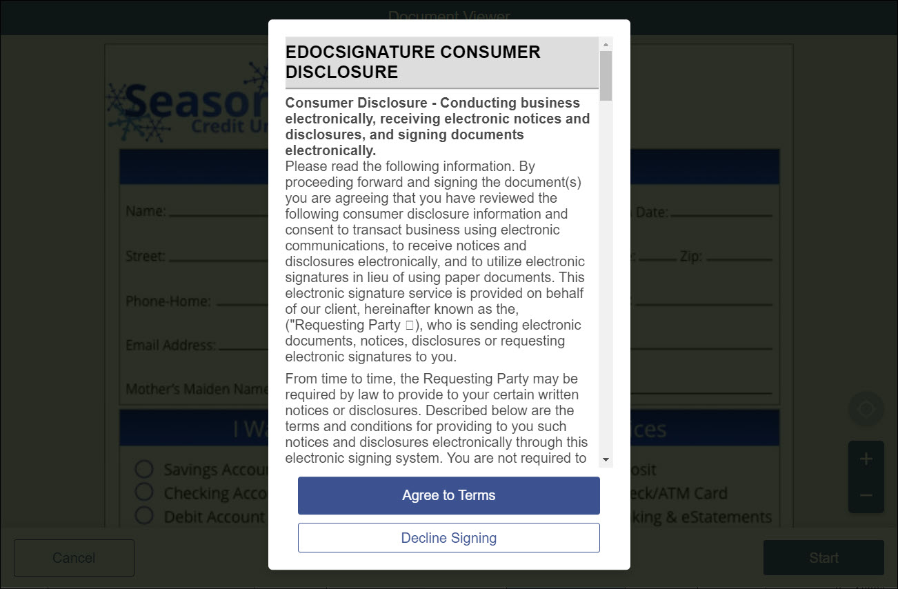 - After clicking Start, the Consumer Disclosure screen appears. The signer taps Agree to Terms to accept the disclosure agreement.