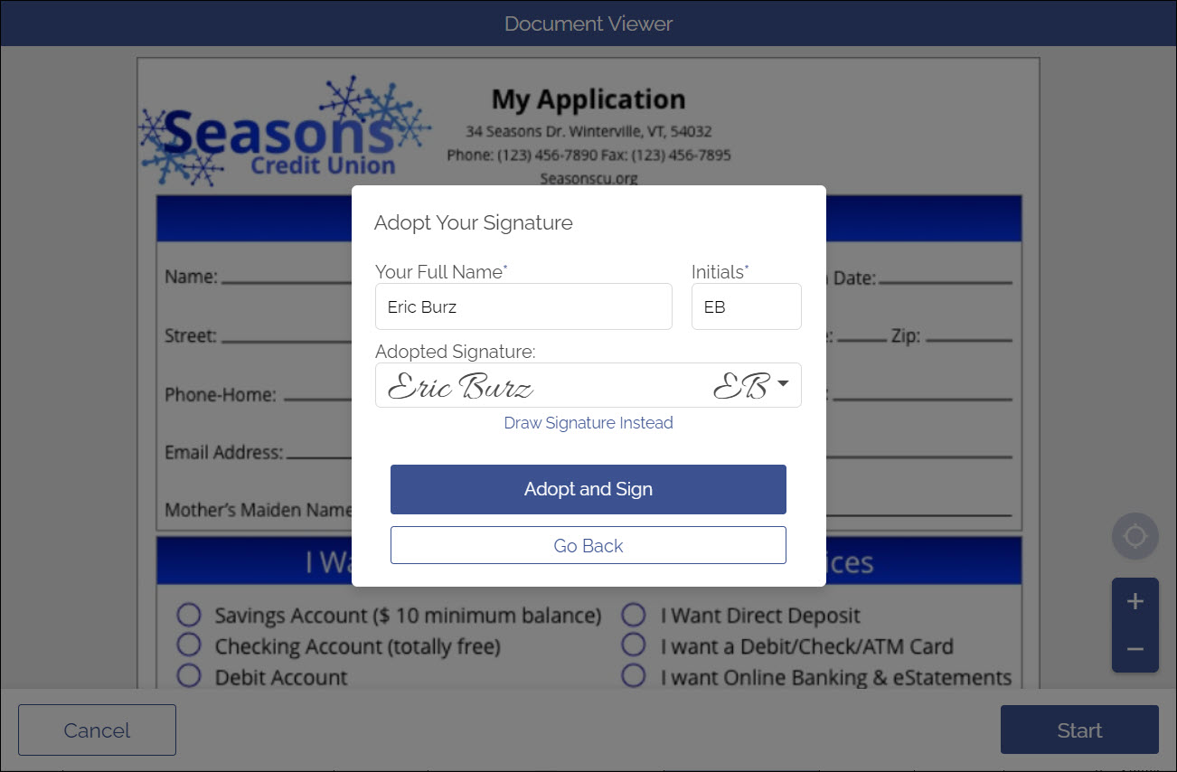 - The Adopt Your Signature screen appears. The signer has the option of typing their name and initials and selecting a signature font. Alternatively, the signer can draw their own signature by tapping Draw Signature Instead. When the signature is ready, the signer taps Adopt and Sign to begin signing.