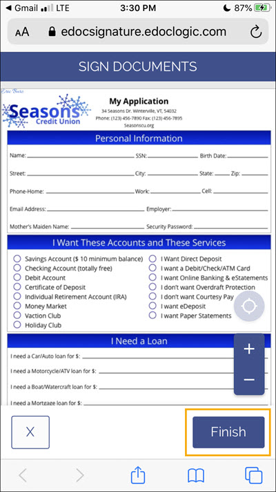 - When all signing elements are complete, the Finish button appears. The signer clicks Finish to finish the signing process.