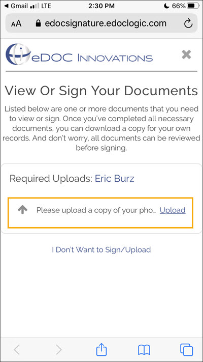 - If any documents have been requested from the signer, the Required Uploads screen appears. The signer taps Upload and chooses the appropriate file to upload.