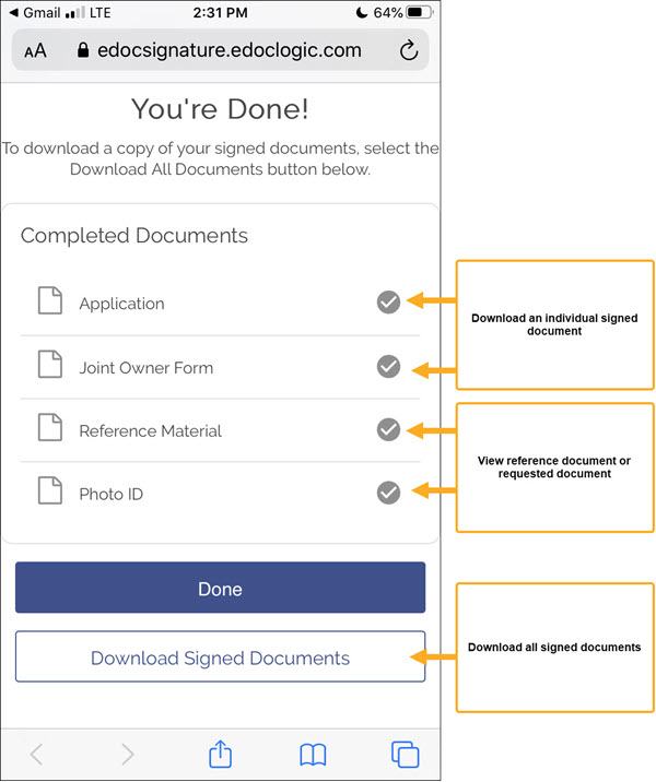 - Once all requested documents have been uploaded, the document signing process is complete. The signer can download a .pdf copy of any/all signed or requested documents before exiting eDOCSignature. They can also downloaded these documents for the next 90 days using the link provided to them in the final "package complete" email notification.