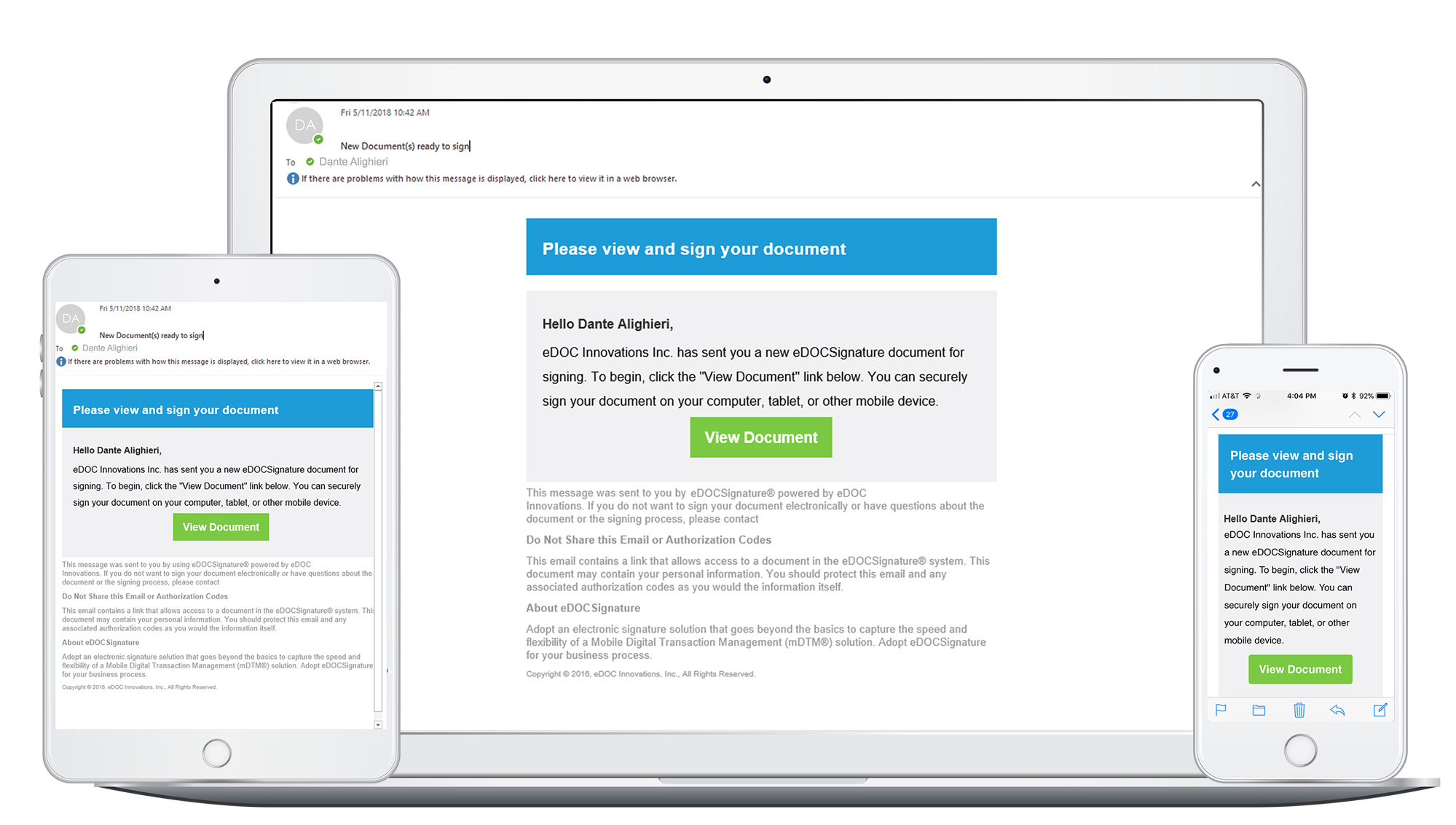- After a package has been sent out for an electronic signature, signers receive an email or text notification from eDOCSignature. The signer opens and sign their documents using a smart phone, tablet or, computer by clicking on the View Document button or text message hyperlink.